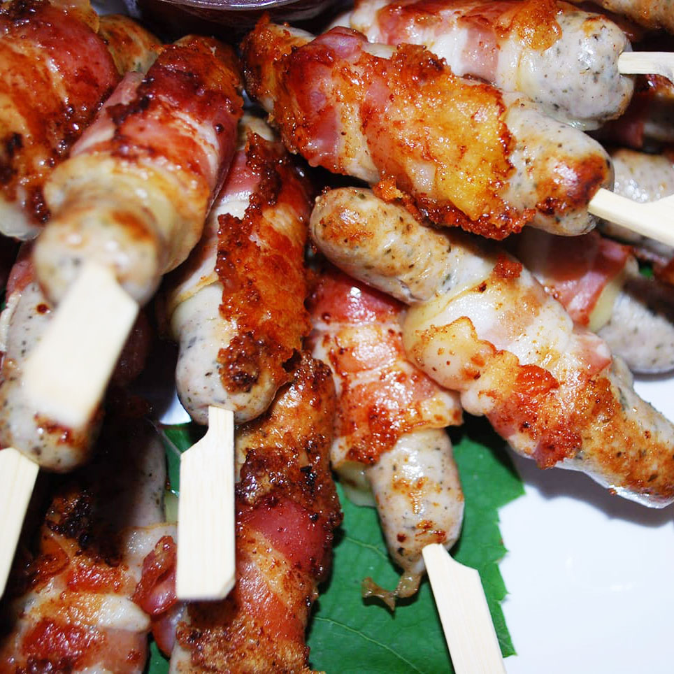 Nürnberger-Bratwurst-Käse-Bacon Spießchen