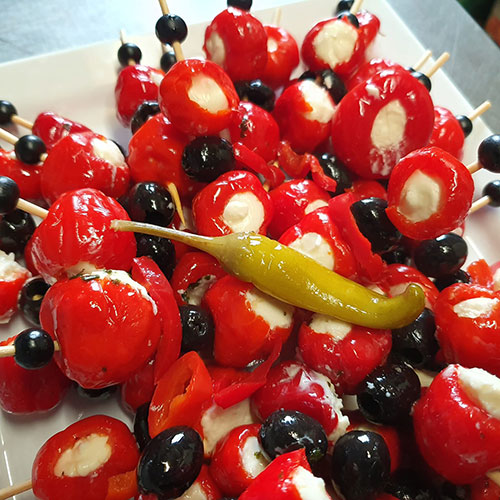 Schafskäse o. Fetakäse, Zwiebeln, Paprika, Oliven, griechischer Gewürzmantel