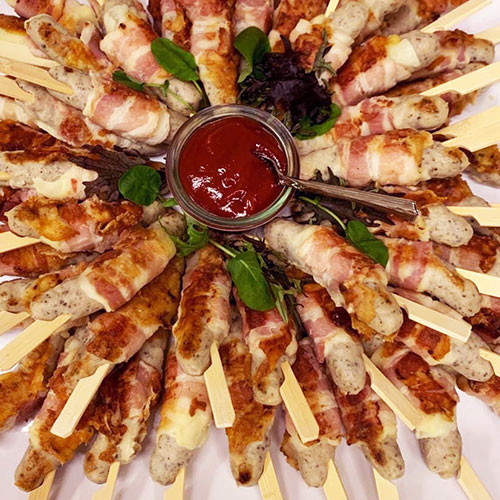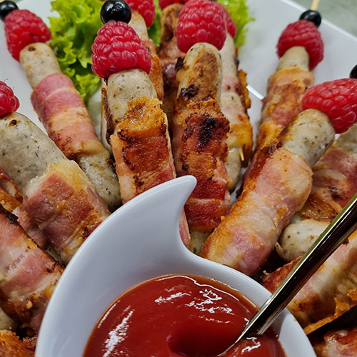 Nürnberger-Bratwurst-Käse-Bacon Spießchen