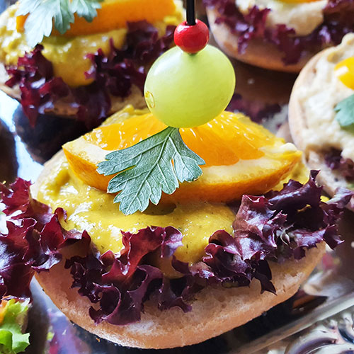 Halbe Gourmet Partybrötchen liebevoll garniert,