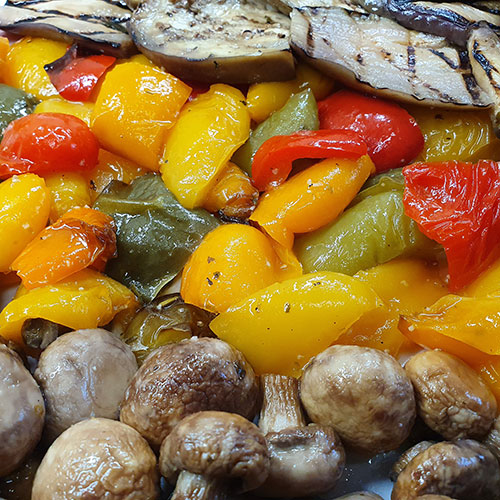 Auberginen, Zucchini, Paprika, Karotten, rote Zwiebeln, Champignons