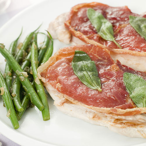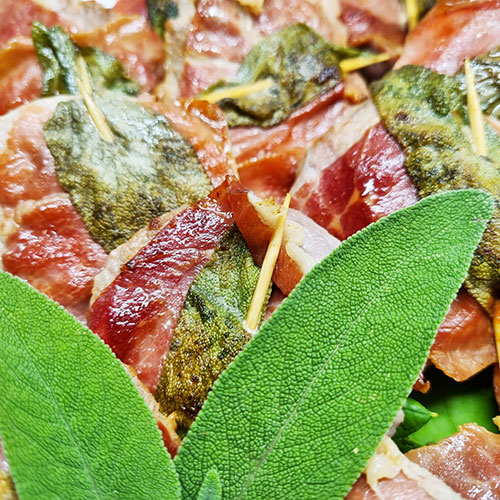 - feinstes Kalbfleisch umwickelt mit Parmaschinken, bespickt mit Salbei